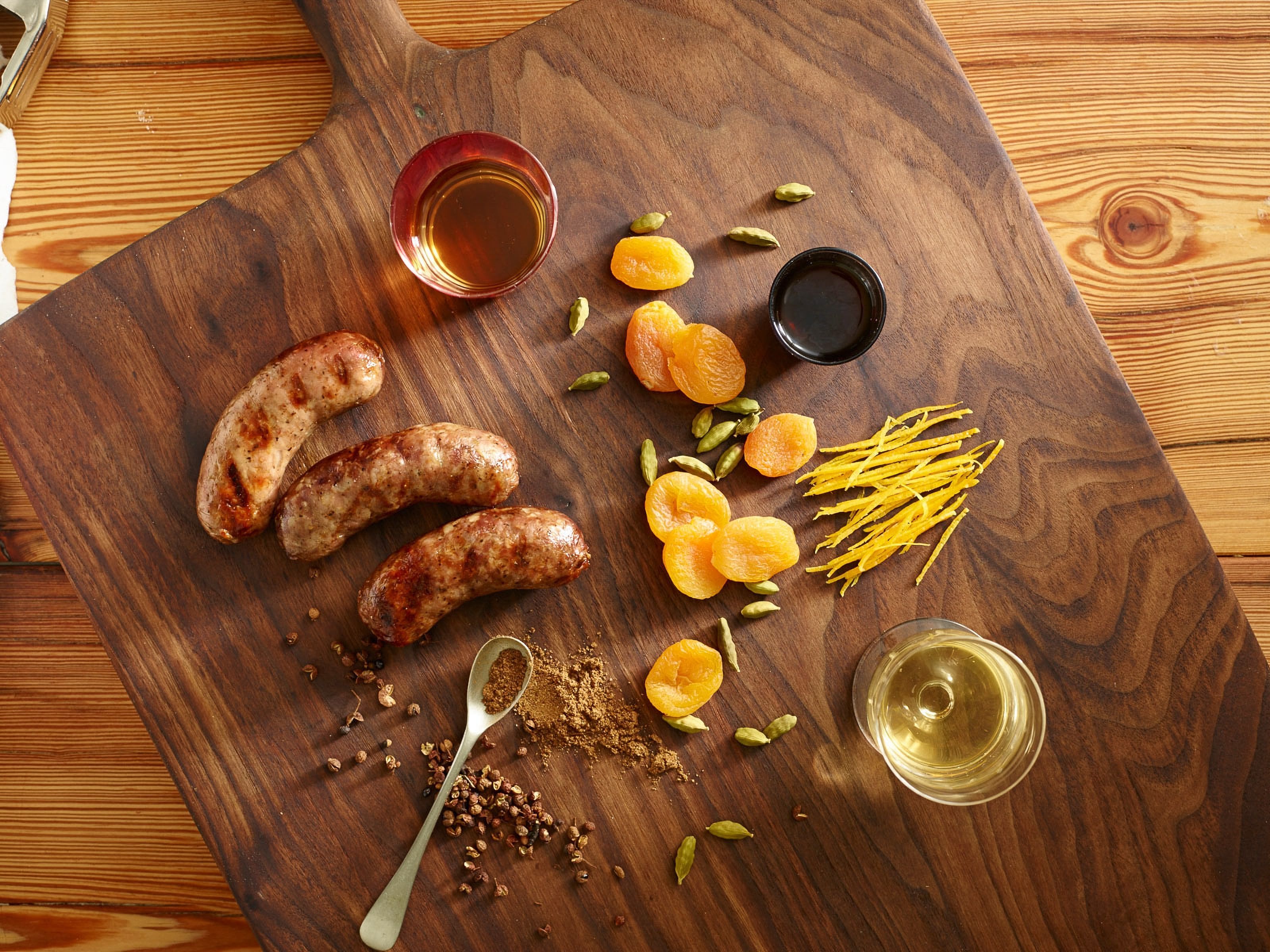 pork, ramps, gruyere, white wine, salt, apple cider vinegar, caraway seed, mustard seed, black pepper, allspice, natural casings