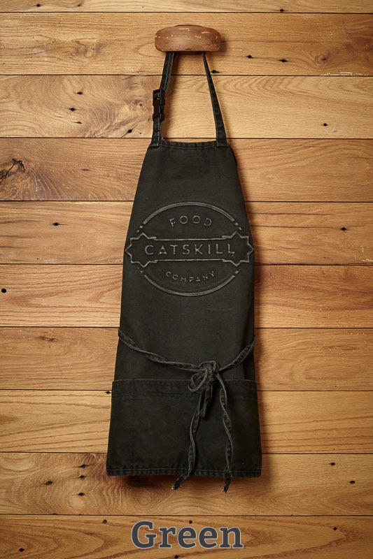 Comes in green, brown, or black. Click/tap on photo to see other colors and detail of embossed logo. Adjustable neck strap. Durable 100% cotton canvas. Three pockets along bottom.