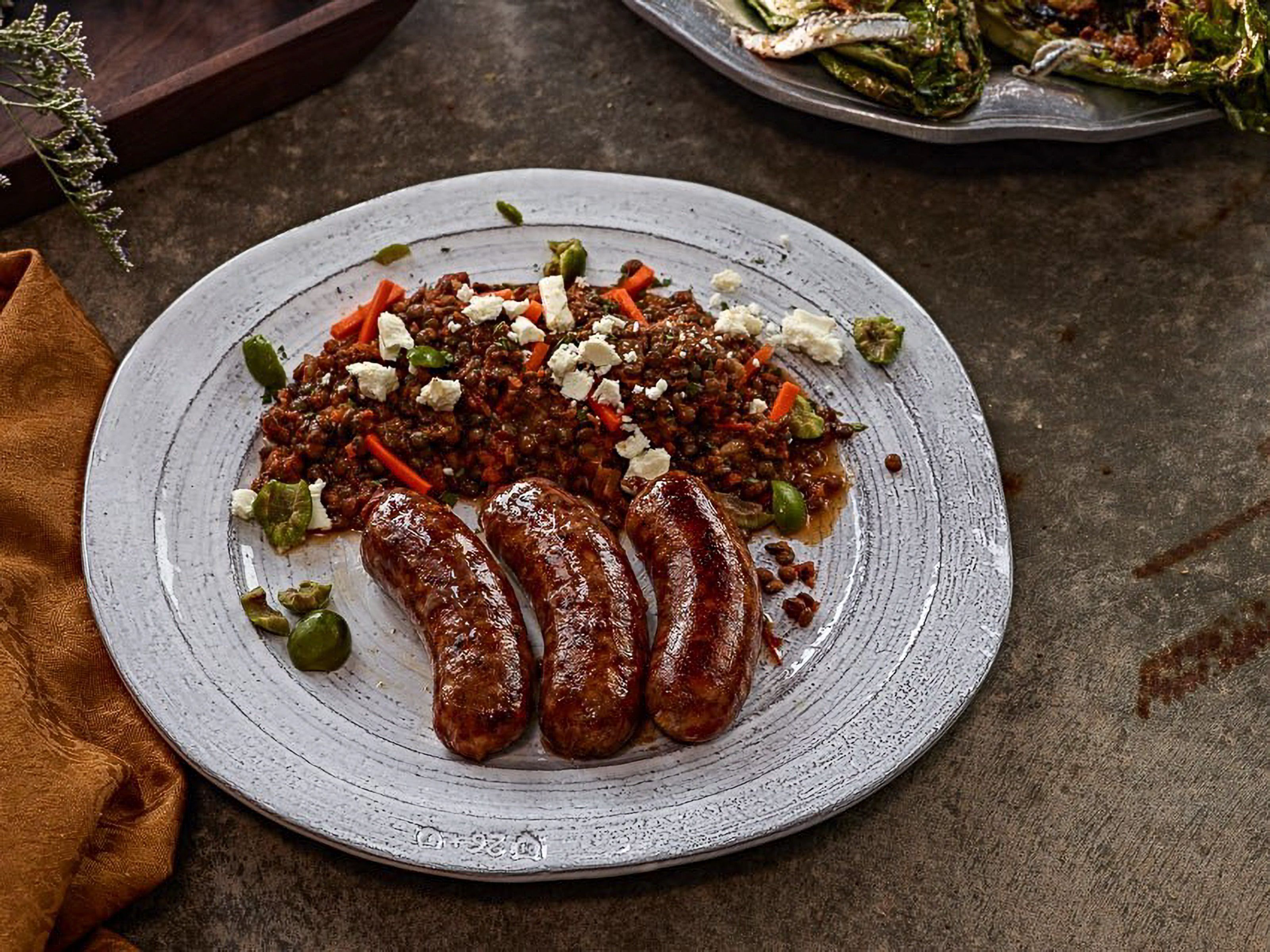 Atop a flavorful French lentil ragout is the perfect way to enjoy a Moroccan sausage, fantastic right off the grill with sangria and a caesar salad.