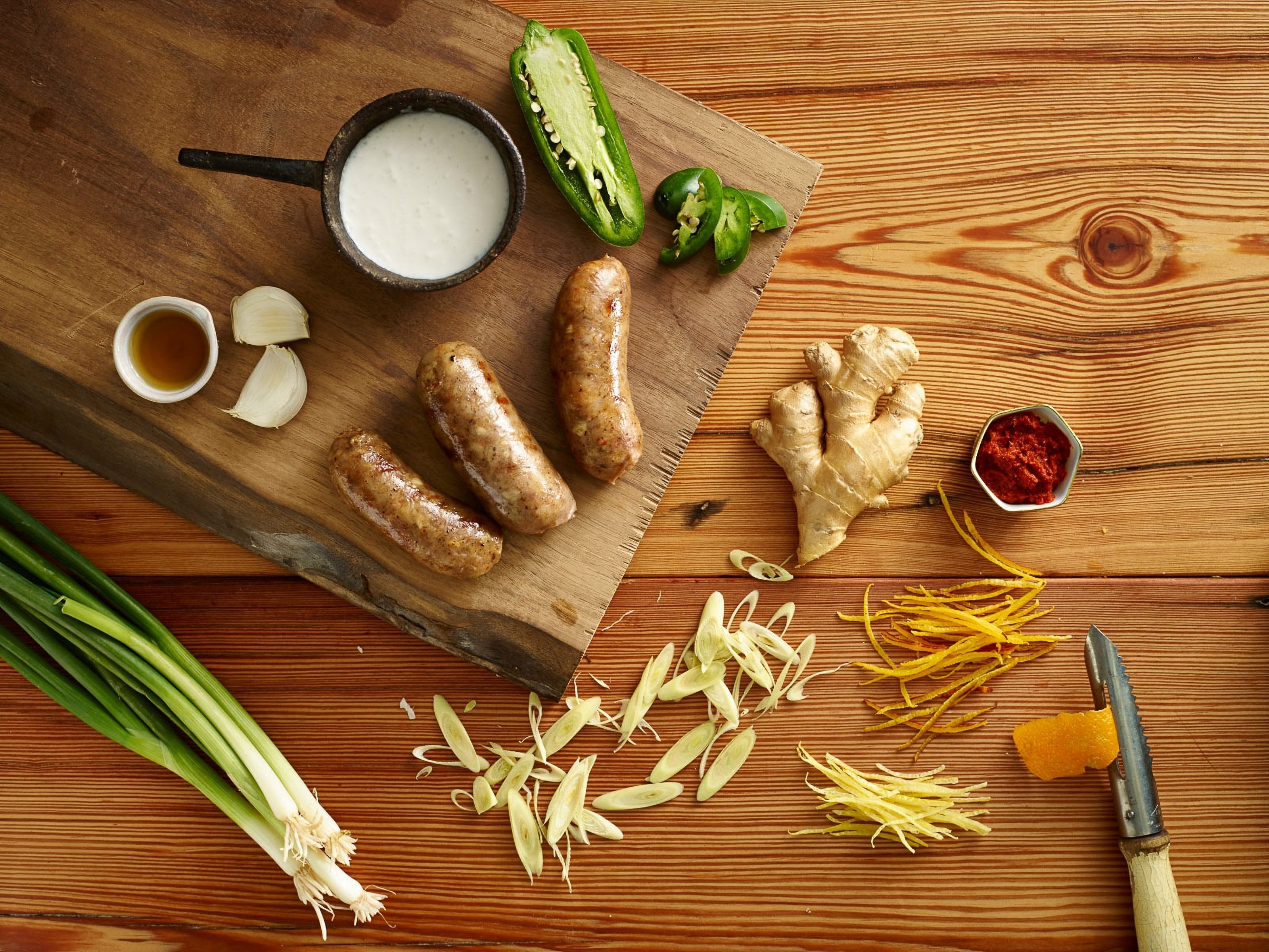 chicken, water, lemongrass, onion, garlic, ginger, cilantro, sesame oil, soy sauce [water, soybeans, wheat, salt, sodium benzoate], fish sauce [water, anchovy, sugar, salt], salt, rice wine vinegar, black pepper, natural Casing